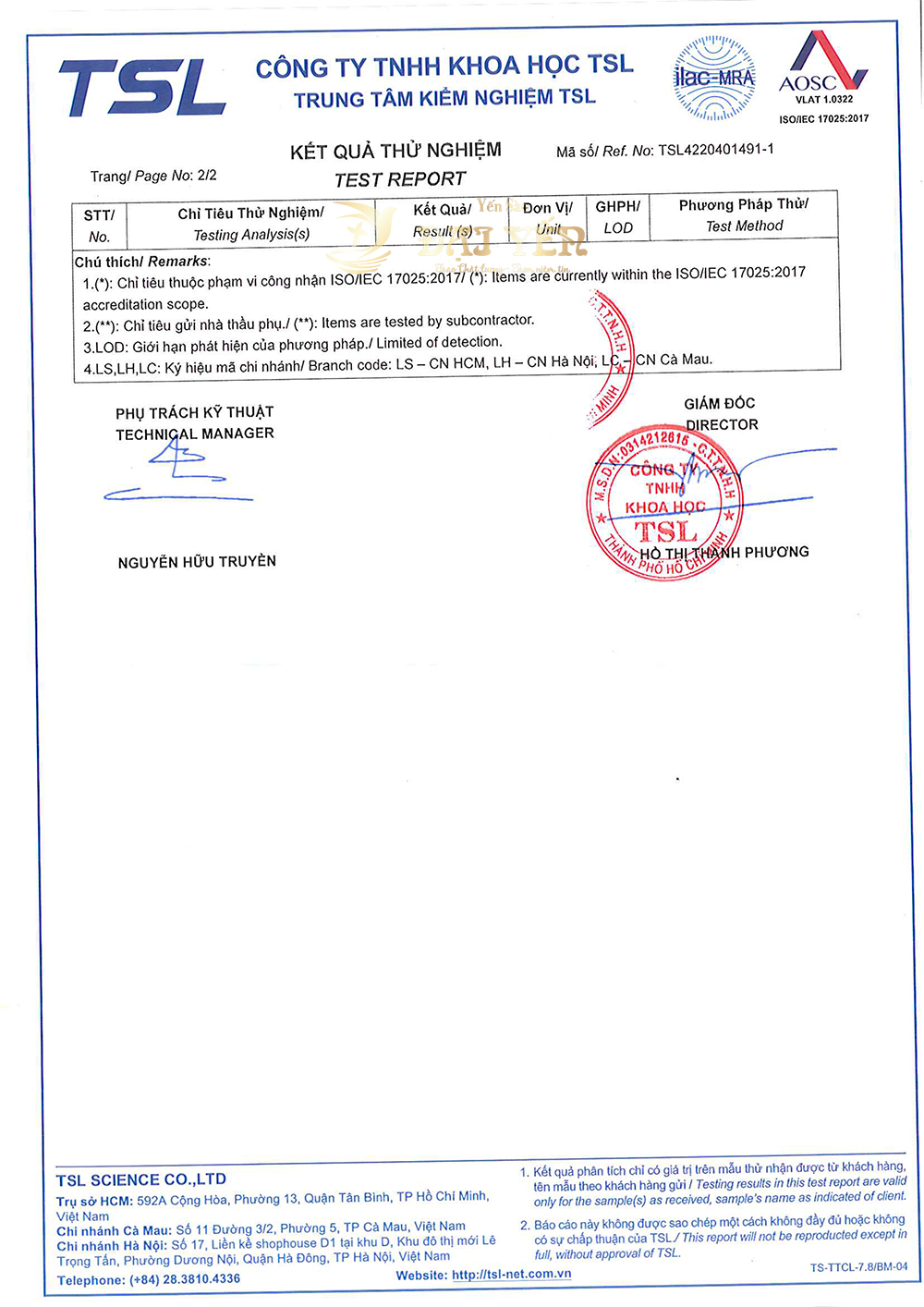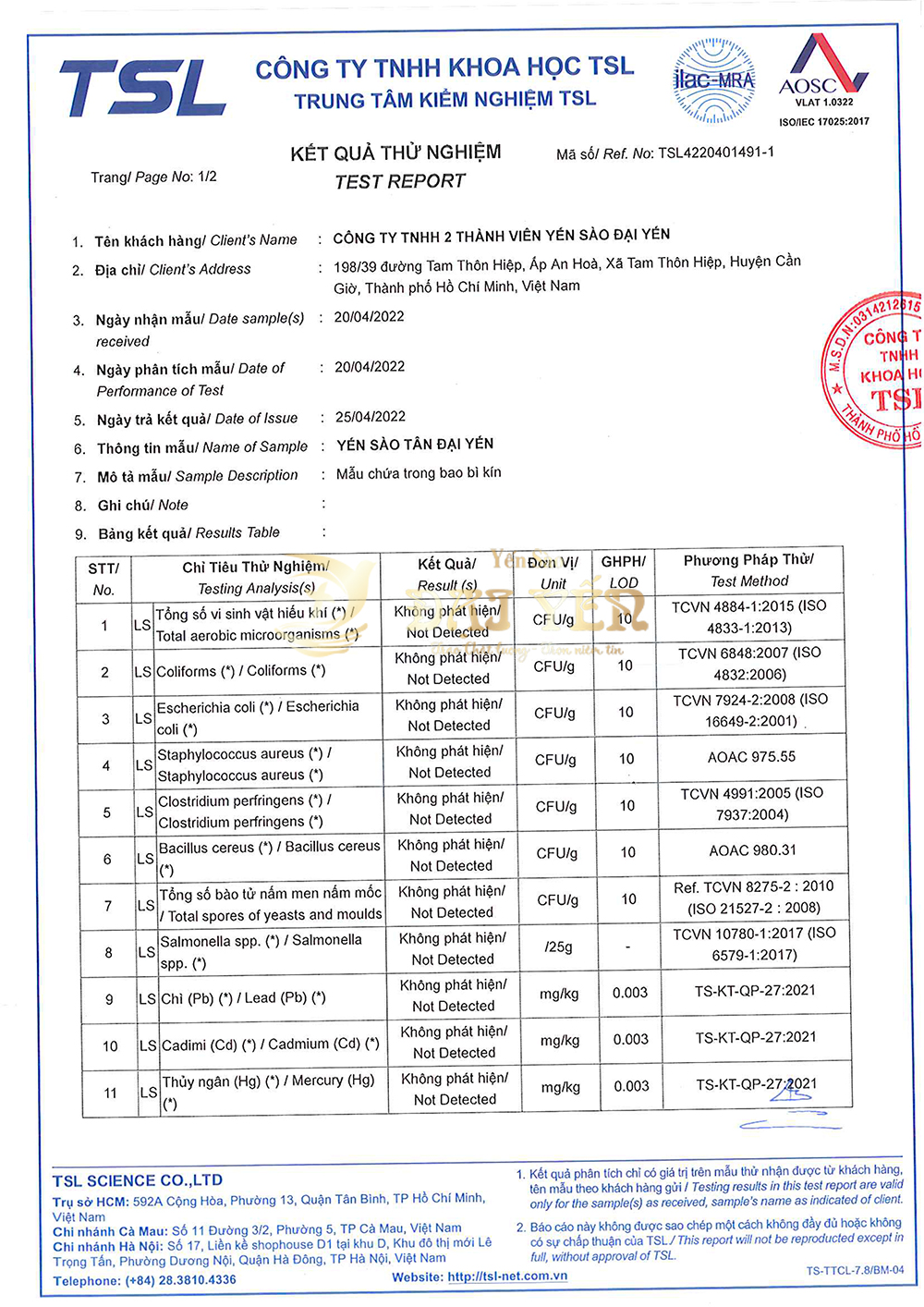 Kết quả thử nghiệm Yến Sào Đại Yến